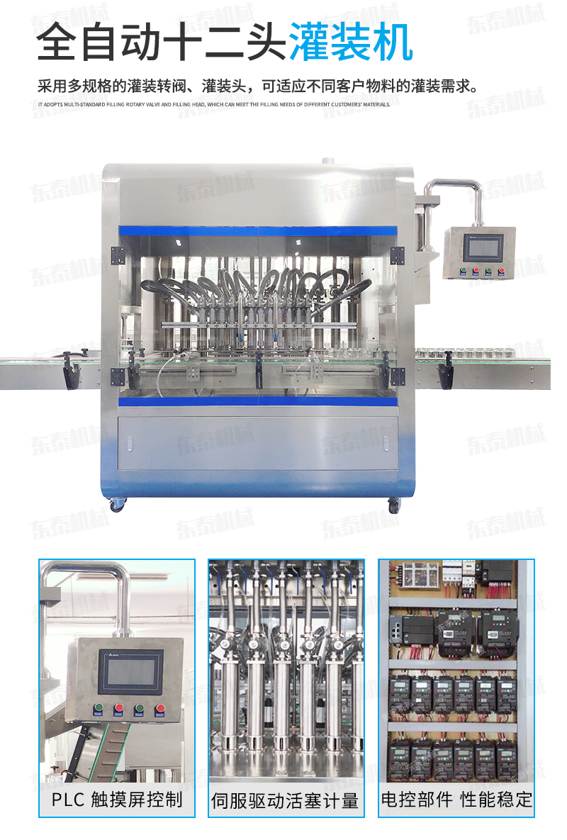 2、灌裝機以進口PLC電腦控制、伺服驅動計量,全彩色觸摸屏人機界面,一鍵完成計量切換確保容量之調整簡易、快捷、準確。是任何形式的灌裝機無法替代的;