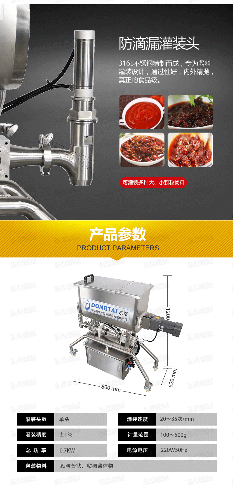 辣椒醬灌裝機 適合于將各類粘稠體及含有各種固體物質如辣椒、花生、肉塊、佐料等物體的醬類和油、料分離的火鍋底料等灌裝于各種容器中,辣椒醬灌裝機 適用于辣椒醬、顆粒醬料、大塊肉醬、火鍋底料等的灌裝。辣椒醬灌裝機 /半自動辣椒醬灌裝機可灌裝顆粒漿狀流體物料,特別適用于調味品中帶顆粒并且濃度較大的辣椒醬、火鍋底料等粘稠醬類的灌裝,配置的自動攪拌器,辣椒醬灌裝機 保證了醬和油的充分混合,又稱為辣椒醬灌裝機、花生醬灌裝機、豆瓣醬灌裝機、果醬灌裝機,芝麻醬灌裝機、粘稠醬類灌裝機、牛肉醬灌裝機。