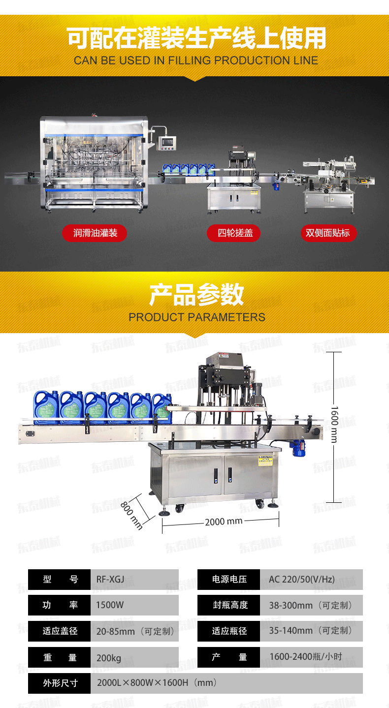 機油自動搓蓋機電氣控制運動,穩定性強; 設有定位裝置,旋蓋標準,操作方便; 鎖蓋范圍寬,可鎖不同形狀規格的瓶蓋;解決了噴頭、泵頭、噴霧泵、手扣式噴頭旋蓋難的