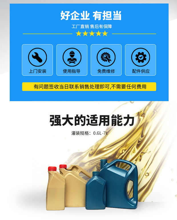 600KG,內(nèi)部設(shè)有阻擋板,避免油品輸入過程油品外冒,同時保證灌裝精度;儲油箱位置設(shè)在灌裝機頂部,自帶可視液位計,頂部箱蓋大包圍設(shè)計并且可以打開,具備排氣功能(排出氣泡等);灌裝頭整體上升方式平穩(wěn),不產(chǎn)生震動,高度及寬度可調(diào)。