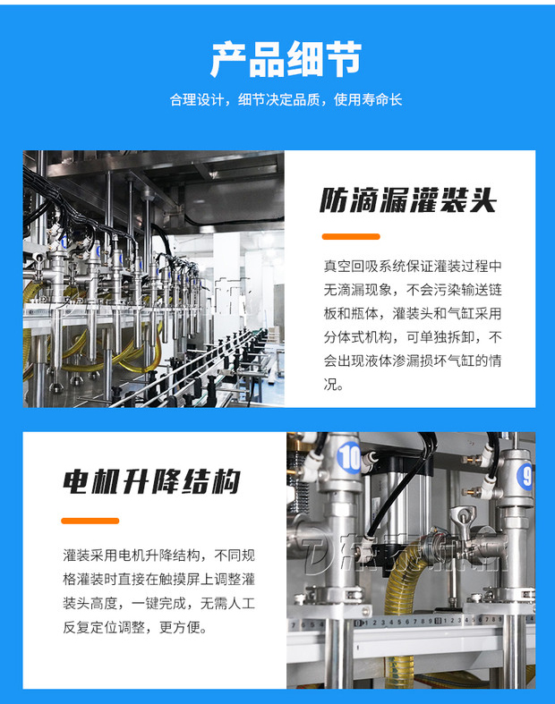 過程中無滴漏現(xiàn)象,不會污染輸送鏈板和瓶體,灌裝頭和氣缸采用分體式機構(gòu),可單獨拆卸,