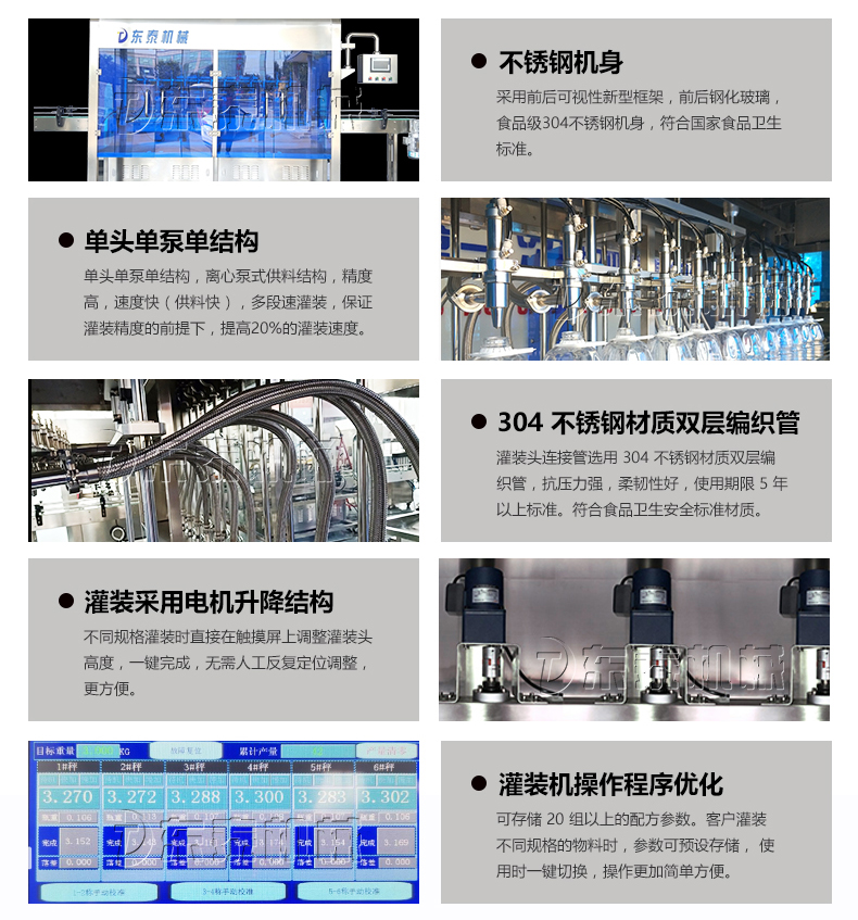 這款油脂灌裝機能夠適用多種流體5kg-30kg的計重量灌裝。自行完成計數進瓶、計重量灌裝、輸送出瓶等一系列的智能操作。 特別是適用于水劑、食用油,潤滑油的定量灌裝,是食品,醫藥,化妝品以及精細化工等多個行業的包裝機。本機采用的是編程控制器(PLC)、高速工控組態軟件進行實時監控的控制,使用調節更加的方便。整機是按GMP標準要求制作的,各管路連接采用快裝方式,拆卸清洗方便,與物料接觸部位及外露部位均采用了優質不銹鋼制造