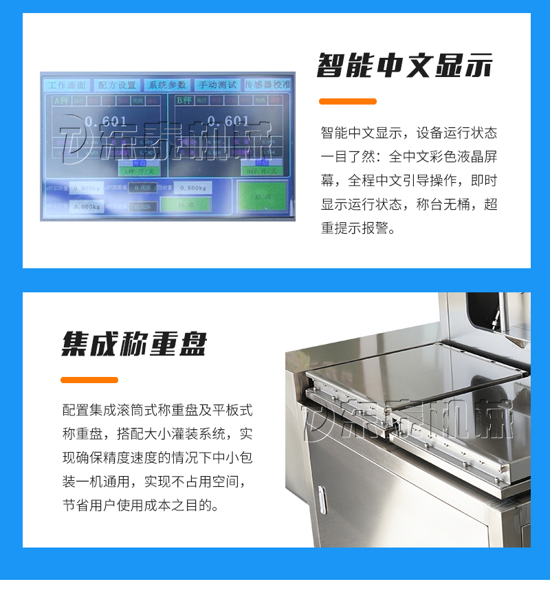 集成滾筒、平板稱重盤,一機多用,方便快捷:配置集成滾筒式稱重盤及平板式稱重盤,搭配大小灌裝系統(tǒng),實現(xiàn)確保精度速度的情況下中小包裝一機通用,實現(xiàn)不占用空間,節(jié)省用戶使用成本之目的。