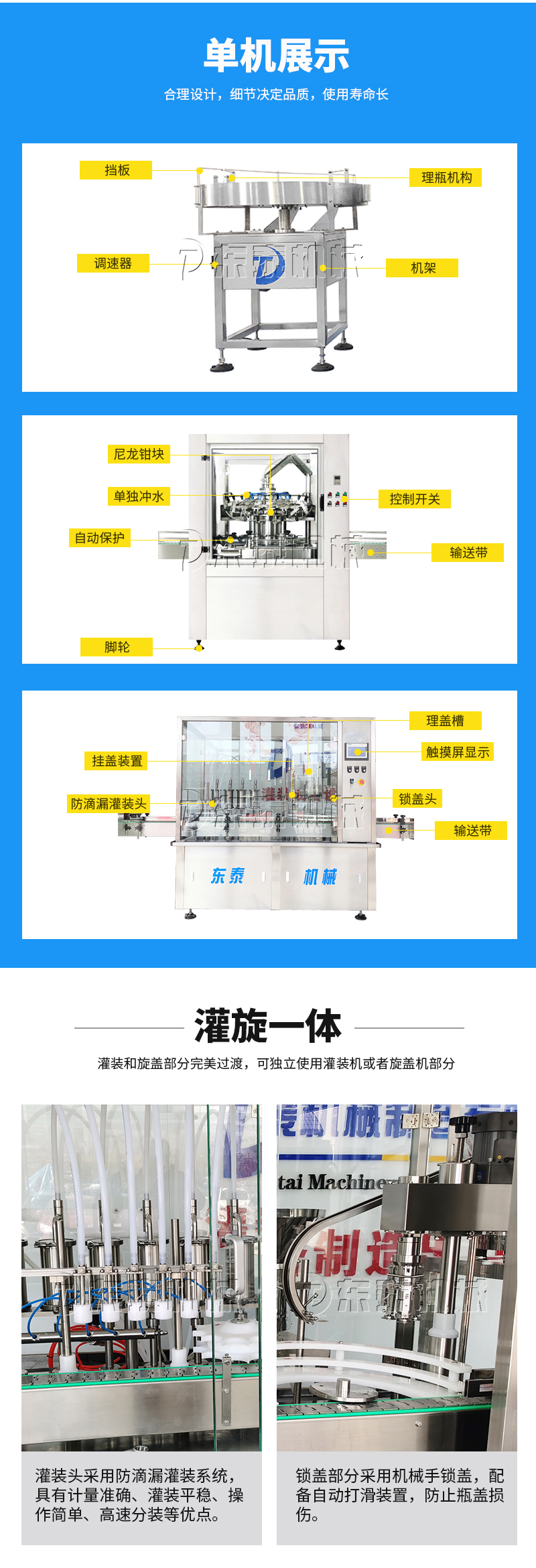 此橄欖油灌裝旋蓋機生產線是由灌裝、上外蓋、旋外蓋、PLC控制等主要部分組成。本機通過凸輪傳動,定位準確,傳動平穩,PLC自動控制灌裝、上蓋、旋蓋等全過程。并可配置全自動注塑機,由吹瓶直接進入灌裝系統,防止交叉感染,整個過程全部在無菌條件下完成,無需洗瓶和烘干。此灌裝旋蓋機適合于食用油、藥品等粘流體的灌裝生產。